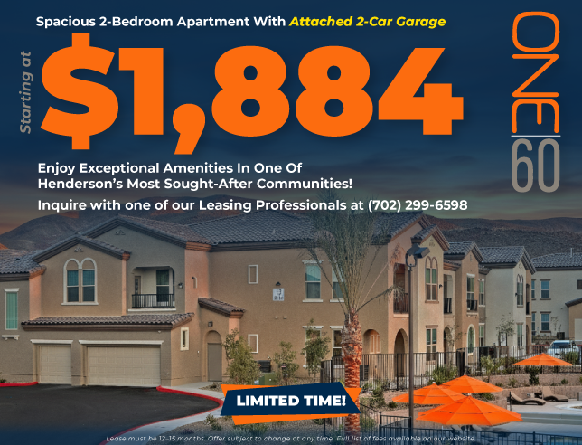 Welcome home to heaven at One60, where luxury living is defined. Our beautiful community features state of the art premium amenities that would exceed your expectations. Come and take advantage of our spacious 1, 2, and 3 bedroom apartment homes each with an attached garage and enjoy great access to shopping and dining. If you are looking for a vibrant community to call home in Henderson, this is the right place to be!